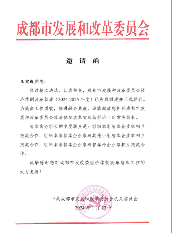 近日,集團黨委書記、董事長王宏毅收到成都市發(fā)展和改革委員會《邀請函》,受邀擔(dān)任成都市發(fā)改委經(jīng)濟體制改革智庫(2024-2025年度)新經(jīng)濟1組常務(wù)組長,組織本組智庫企業(yè)家及智庫外企業(yè)家交流合作。