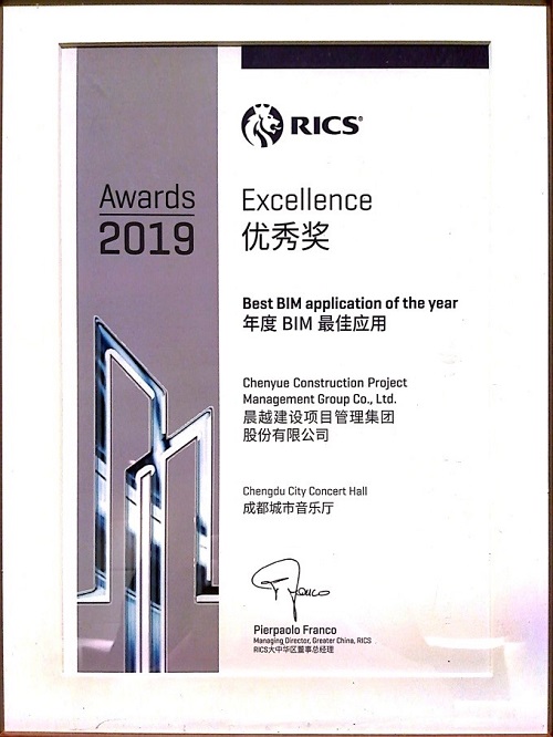 2018年2月,成都城市音樂廳主體完工。12月,2019年新年音樂會在音樂廳召開。2019年4月,英國皇家特許測量師學(xué)會(RICS)年度晚宴及RICS Awards China 2019頒獎典禮召開,晨越建管集團(tuán)“成都城市音樂廳”獲得“年度BIM最佳應(yīng)用”組的Excellence(優(yōu)秀獎),該項目系與中國尊/迪斯尼項目同臺競賽。