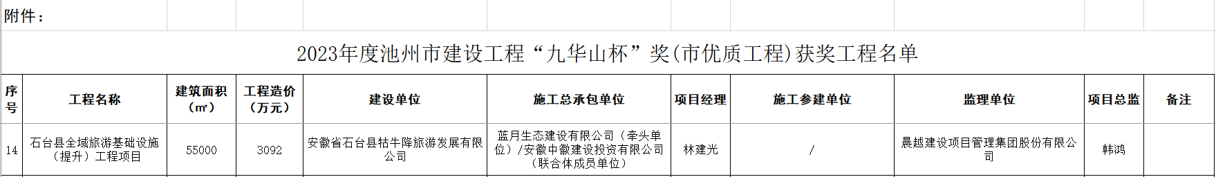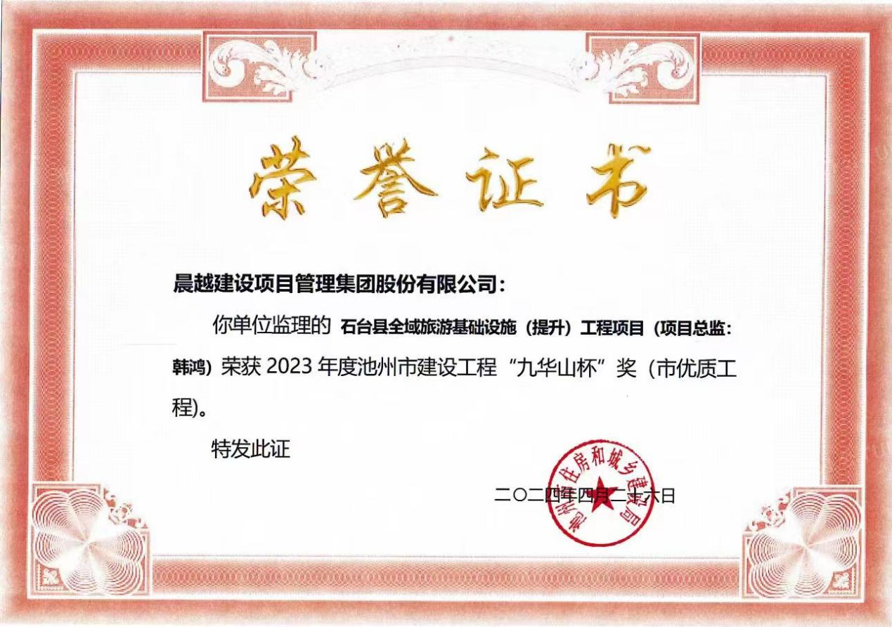 【晨越全咨】集團(tuán)池州市石臺(tái)縣全域旅游基礎(chǔ)設(shè)施項(xiàng)目榮獲2023 年度池州市建設(shè)工程“九華山杯”獎(jiǎng)(市優(yōu)質(zhì)工程)