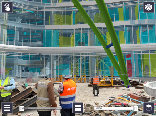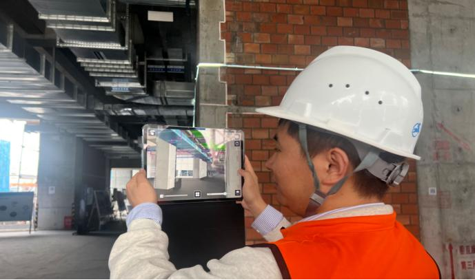 此外,項(xiàng)目創(chuàng)新性引入 AR 技術(shù),將 BIM 模型投射至實(shí)體環(huán)境中,對項(xiàng)目重難點(diǎn)區(qū)域進(jìn)行實(shí)模對比,實(shí)時(shí)發(fā)現(xiàn)并解決問題,有效輔助機(jī)電安裝實(shí)體與模型校核、鋼結(jié)構(gòu)構(gòu)件與模型校對等工作,確保施工精度與工程質(zhì)量,為項(xiàng)目建設(shè)提質(zhì)增效。?