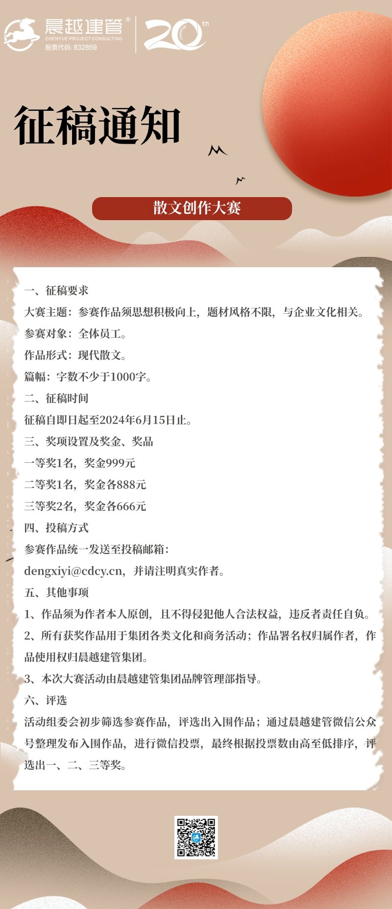 2024年是晨越建管集團(tuán)成立二十周年之際,為宣傳、弘揚(yáng)晨越文化,以散文形式呈現(xiàn)晨越人文之美、精神之美,現(xiàn)舉辦散文創(chuàng)作大賽。