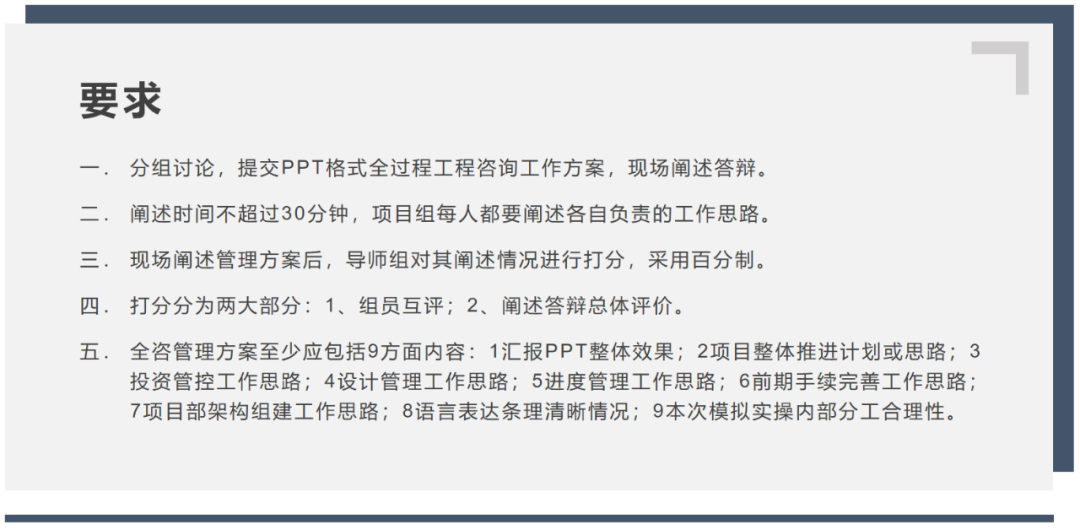 經(jīng)過短暫的休息,徐旭東總給出某全咨項(xiàng)目的案例背景,將參培人員分為6個(gè)小組,每小組指定一名小組長作為項(xiàng)目負(fù)責(zé)人,組員根據(jù)自身擅長領(lǐng)域分別擔(dān)任設(shè)計(jì)、投資、進(jìn)度、質(zhì)量、安全、合同管理等負(fù)責(zé)人,就各自負(fù)責(zé)范圍進(jìn)行思考,梳理工作思路,編制全過程工程咨詢工作方案,六個(gè)小組分別由徐旭東、趙清泉、陳代蓮、張述林、何勇5位導(dǎo)師帶隊(duì)指導(dǎo),要求第二日下午進(jìn)行匯報(bào)答辯。